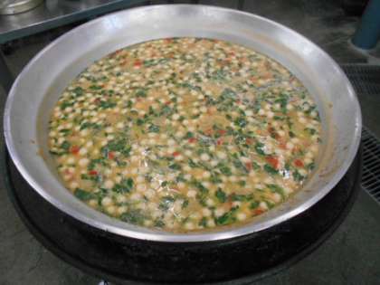 中の写真は、お雑煮が出来上がった写真です。おもちといろいろな具材を入れた汁ものです。地方や家庭によって入れる具や味つけなどに特色があります。今日の給食では、白みそで味をつけています。