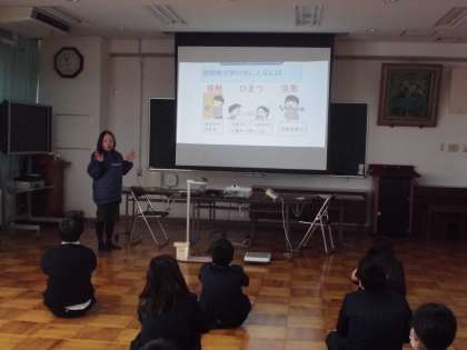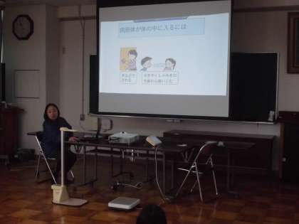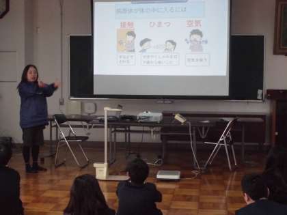 保健室の先生から発育測定を行う前に「感染症の予防」について教えていただきました。感染症はどのようにして自分たちの体に入ってくるのか。また、予防するにはどのようなことをしたらいいのかについて学びました。自然治癒力を高めるために普段からできることについて考えました。