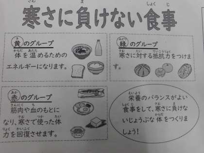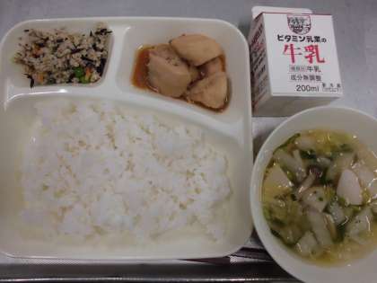 今日の給食は、鶏肉の甘みそ焼き、五目汁、高野豆腐のいり煮、ごはん、牛乳です。栄養のバランスがよい食事をして、寒さに負けないじょうぶな体を作りましょう。