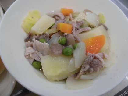 今日の給食は、豚肉と野菜のスープ煮、カレーソテー、りんご、黒糖パン、牛乳です。