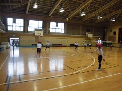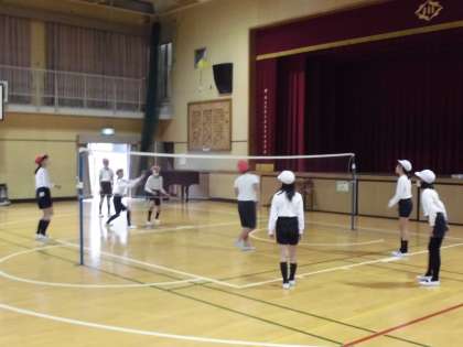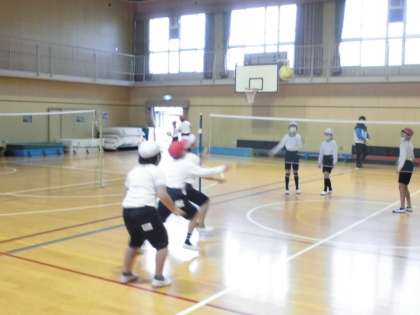 キャッチバレーボールの学習の前段階です。ボールをキャッチして、3回パスして相手のコートに投げ返します。