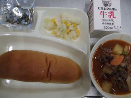 今日の給食は、ビーフシチュー、カリフラワーとコーンのサラダ、ミニフィッシュ、黒糖パン、牛乳です。毎日の給食は、たくさんの人の協力によって作られています。感謝の気持ちをもって、大切にいただきましょう。