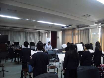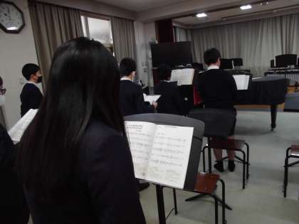 今日は音楽室でピアノ伴奏に合わせて合唱の練習をしています。男子も女子もよく声が出ていて、ハーモニーがきれいです。