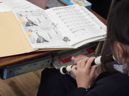 「♪雪のおどり」の合唱と合奏です。リズムにのって曲の感じをとらえながら歌ったり演奏したりしました。