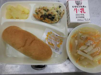 今日の給食は、ホタテ貝のグラタン、スープ、パインアップル(かんづめ)コッペパン、マーマレード、牛乳です。
