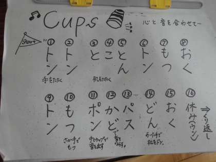 「♪TODAY」の曲に合わせて「Cups」をします。曲の中で紙コップや手を叩きます。音楽や友だちと心と音を合わせて演奏します。