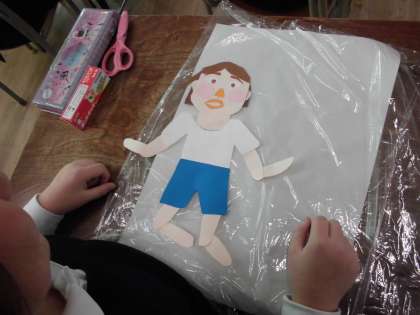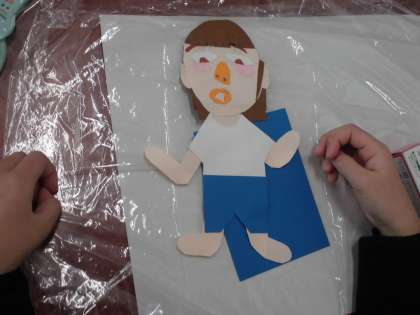 紙版画にくつをはかせよう!大分完成に近づいてきました。足の向きを考えてどのように靴をつけたらいいかな!?