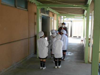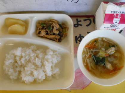 今日の給食は、豚肉と干しずいきのみそ煮、すまし汁、あげ焼きじゃが、ごはん、牛乳です。ずいきとは、さといもの葉と茎をつないでいる部分を呼びます。干しずいきは、ずいきの皮をむいて、水にさらした後、乾燥させたものです。食物繊維やカルシウム、鉄を多く含んでいます。今日の給食では、干しずいきを煮物に使っています。