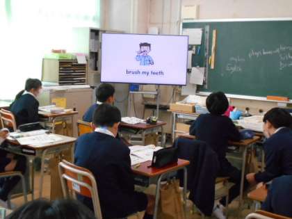 一日の生活に関係する語句を、英語で先生と一緒にリズミカルに発音しています。
