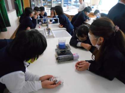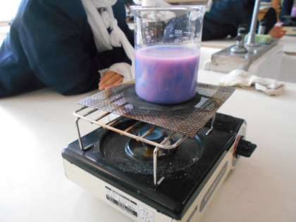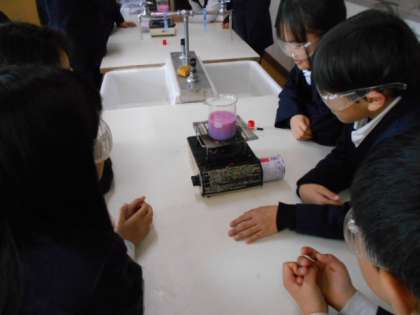 今日は理科室で「水のあたたまり方」の実験をしています。温まると色が変わる示温インクを溶かしたビーカーをガスコンロで温めて、みんなで観察しています。色が少しずつ青からピンクに変わってきました!どこから色が変わっているかな?どんなふうに変化しているかな?しっかり観察しよう!