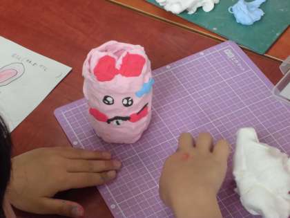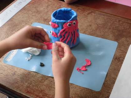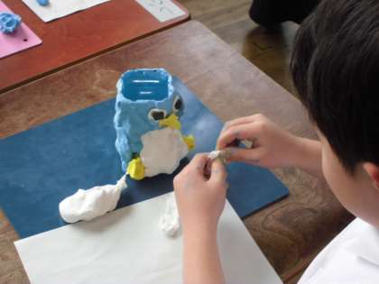1年生も紙粘土で鉛筆立てを作っています。ペンギンやタコなどいろいろな生き物をかわいい作品がたくさんあります。