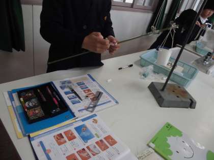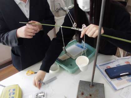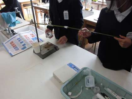 手作り「さおばかり」の学習です。てこを利用したさおばかりをつくり、実際にいろいろなものの重さを測ってみます。紙コップに重さをはかりたいものを入れ、乾電池の重りを左右にずらして、つり合う位置の目盛りを読み取ります。電子てんびんでも重さを測って、結果を比べてみます。さて、作ったさおばかりは重さを正確に測ることができたのでしょうか?