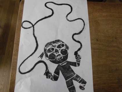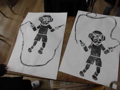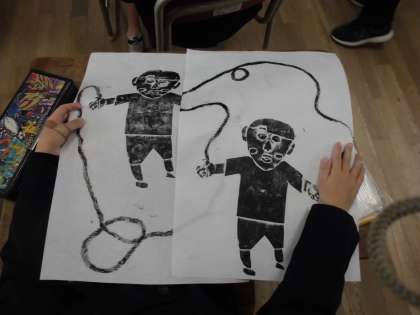 図画工作の時間です。先日刷った版画をどちらを掲示するかを選んでいました。