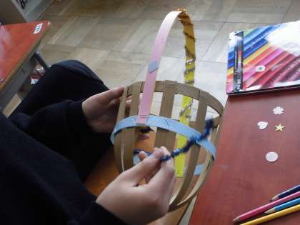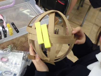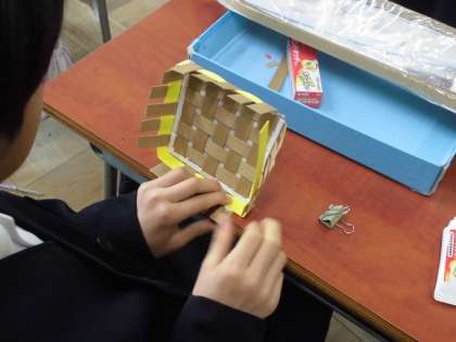 「つないで組んで、すてきな形」の学習です。かごや箱の形、球体などいろいろな形を作っています。