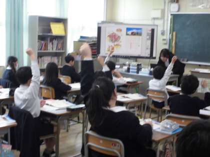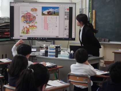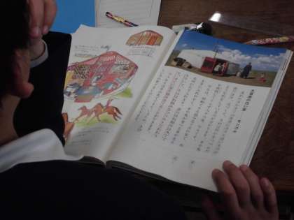 国語科「人をつつむ形 世界の家めぐり」の学習です。今日は、モンゴルの家のつくりについて工夫を読み取る学習です。モンゴルの土地の特徴や人々のくらしに着目しながら学習を進めました。見つけた工夫やくらしについて書かれてある本文に線を引いて全体で確認しました。