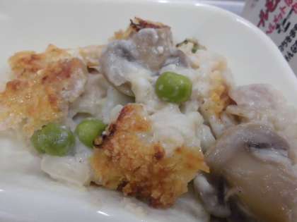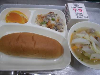 今日の給食は、押麦のグラタン、豚肉と野菜のスープ、黒糖パン、デコポン、牛乳です。