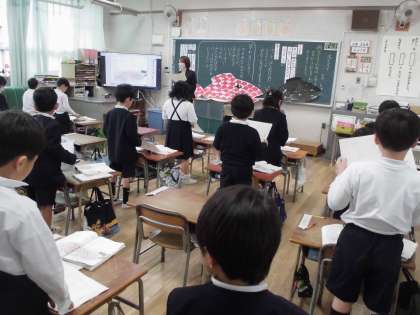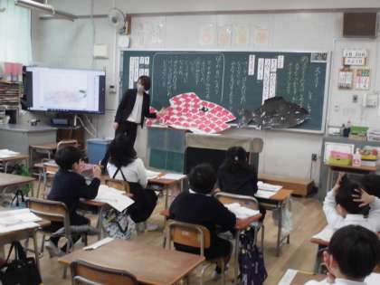 「スイミー」の学習です。今日は最後の第6場面の学習です。スイミーたちはどのようにして大きなさかなをおいだしたのかを想像しました。「そうだ みんな いっしょにおよぐんだ。うみで いちばん 大きな さかなのふりをして。」本文の言葉をもとにみんなでなりきりながら大きな魚を作りました。