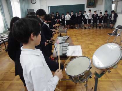 多目的室では、4年生が学習参観に向けて練習をしています。4年生も合同でいろいろな発表を行う予定です。「もののけ姫」の曲を合奏しています。