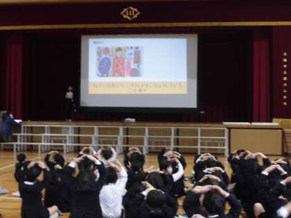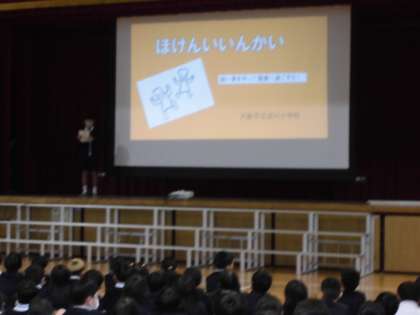 今日の児童集会は、保健委員会の発表でした。テーマは「強い骨を作って健康に過ごそう」です。発表だけでなく、クイズを挟んでみている人も参加型の形式でした。