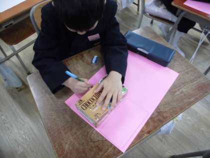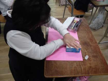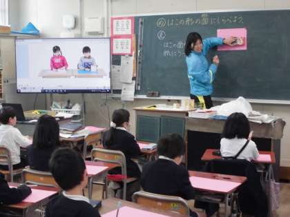 箱の面を画用紙に書き写して、形や数を調べました。しっかり押さえておかないと箱がずれて線が曲がってしまうので、なかなか難しいです。