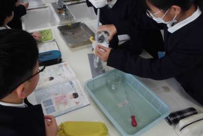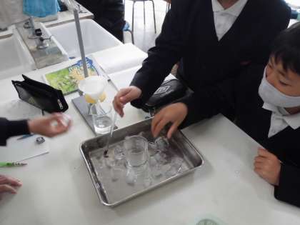水に溶かしたミョウバンを取り出す実験です。氷水の入ったバットでミョウバン水を冷やしています。