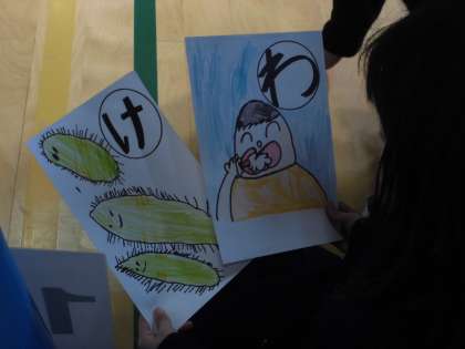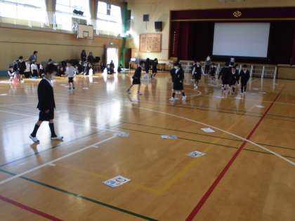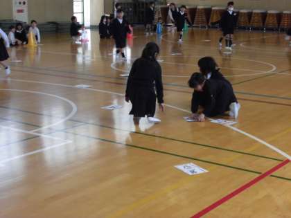講堂では、1・2年生のかるた大会が行われていました!1年生の手作りのかるたで、2年生を招待して一緒に楽しみました。ぶつかるなどのケガがないように歩いて取りに行くルールです。チーム戦で、いちばん多く取れたチームは、6枚とったチームでした!
