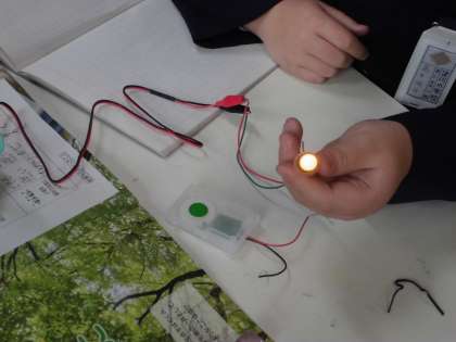 「発電と電気の利用」の単元です。今日の学習は、手回し発電機は、乾電池と同じような働きをするのか予想や仮設をもとに実験しよう です。プロペラ付きモーターや電子オルゴール、発行ダイオードを使って実験しました。