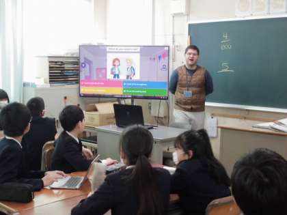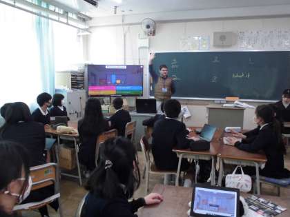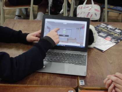 一人一台パソコンをグループで使って、クイズ大会です。パソコンをタッチするとグループの答えを解答することができます。