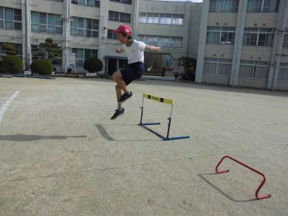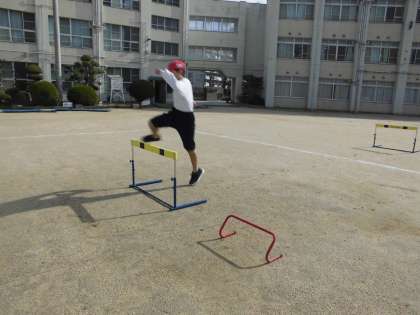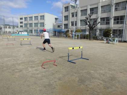 ハードル走のタイムを測りました。等間隔に置かれたハードルをリズミカルに走り超えて記録に挑戦します。スピードに乗ってハードルを走り超えます。
