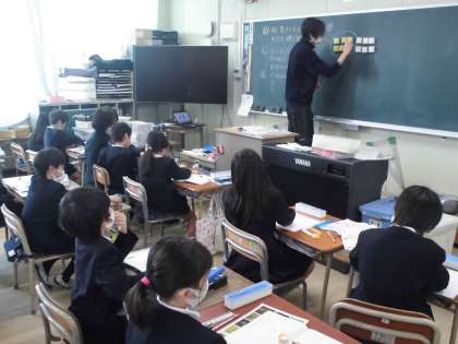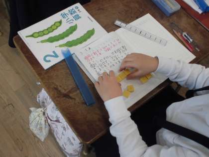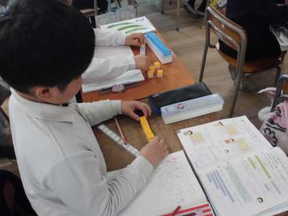 分数の学習をしています。12このブロックを「6こずつ」「4こずつ」「3こずつ」など同じ数ずつに分けて、1つのまとまりが12この「2分の1」「3分の1」「4分の1」と分数で表せることを学習しました。