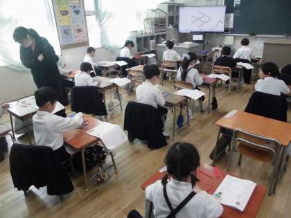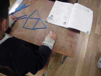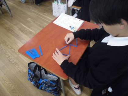 「かたちづくり」の学習です。今日は棒を使って、教科書のお手本と同じ形を作りました。