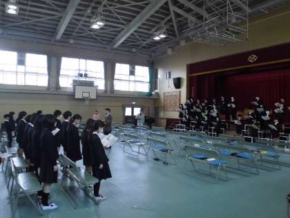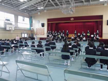 5・6年生合同の卒業式の練習が始まっています。緊張感ただよう雰囲気の中、5年生も在校生代表としてがんばっています。