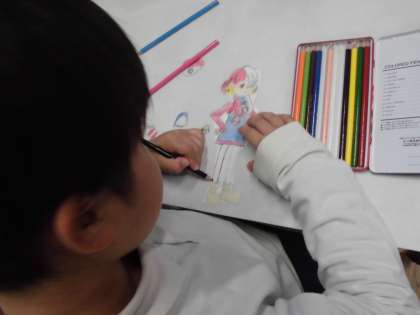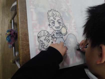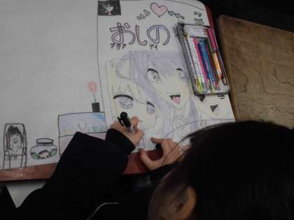 2年生の教室では、作品袋に絵を描いています。白い作品袋に思い思いの絵を描いています。うつしながらもなかなか細かいところまで上手に描いています。