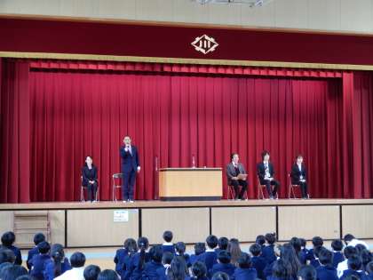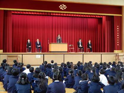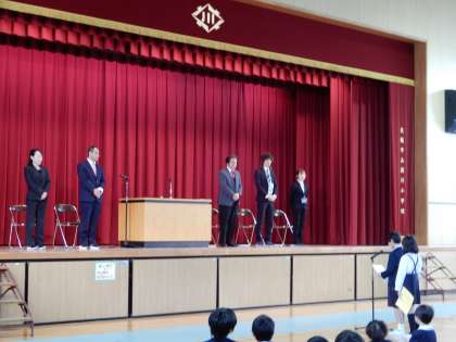 最初の式は、「着任式」です。新たに5人の先生が淀川小学校にやってきました。校長先生も教頭先生も、新しい先生です。子供たちは、どんな先生か興味津々で先生方の自己紹介を聞いていました。