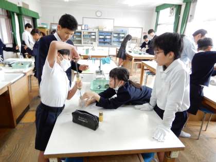 6年生は、理科室で「燃焼実験」を行っていました。物が燃えるときには、何が起こるのかを実験を通して学習していました。自分で学習に課題を持って、探求心を持ちながら学んでいる6年生…。これからも、たくさんの実験を楽しんでください。