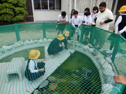 飼育委員会が、今年からカメの世話を行ってくれています。カメの餌やりをしたり、時々カメの散歩をしたり、とても楽しそうです。