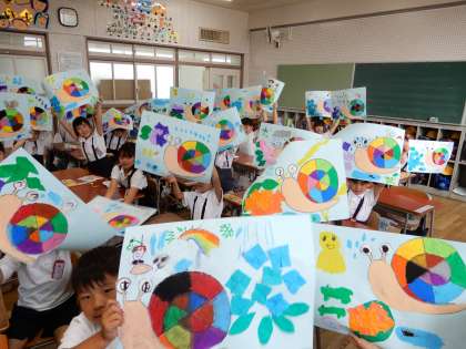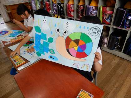 1年生が図工で、「すてきなかたつむり」という作品作りをしました。