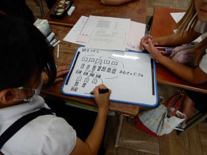 図を使って考えたり、位ごとに計算する方法を考えたり、0,01をもとにして考えたり、様々な意見がグループででていました。その考えを、ホワイトボードに上手にまとめていました。