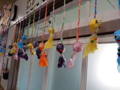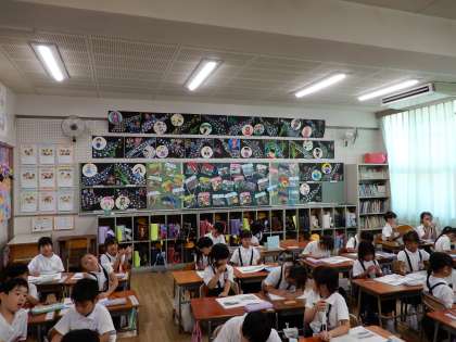 教室中に、1年生の子どもたちが作った美しい掲示物があちこちに掲示されています。