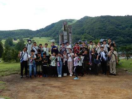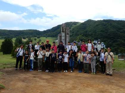 (写真上)5年1組のみんなで記念写真です。ハチ高原のモニュメントの前で、「ハイチーズ!!!」