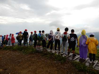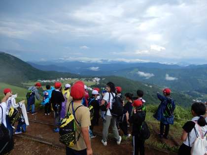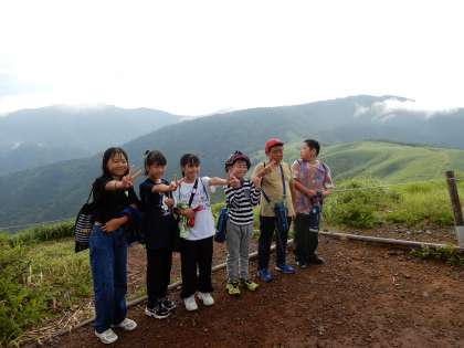 (写真中)山頂から、活動班のみんなと声をそろえて、「ヤッホー!!!」正面には、兵庫県の最高峰「氷ノ山」が見えていました。