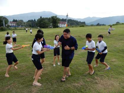 (写真上)伊藤先生と子どもたちの水の決戦です。伊藤先生、びちゃびちゃです。子どもたちの水鉄砲の威力抜群です。