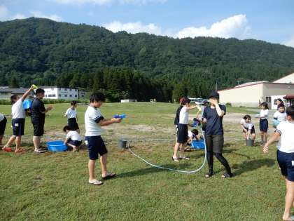 (写真下)丸尾先生の必殺、「水ホース攻撃」・・・。子どもたちも水鉄砲で応戦です。