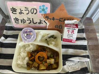 初日の献立は、子どもたちに大人気のカレーライスで、また月に1回のラッキー人参も実施しました。