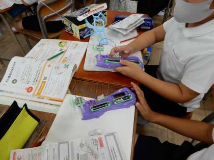 子どもたちは、「どうすれば、プロペラがより早く回るか」を、回路をつなぎながら実験していきます。