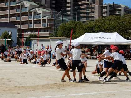(写真上)5年生の「棒引き合戦」です。力だけでなく、作戦も必要になってきます。