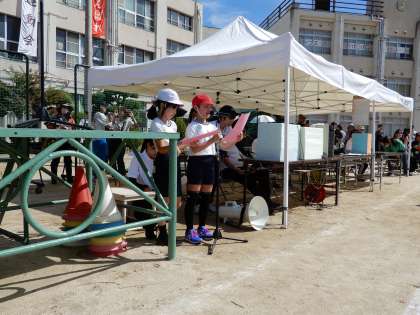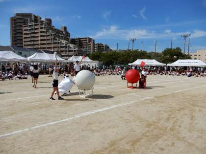 (写真下)この「全校大玉送り」は、何と子どもたちが司会を進めて行いました。司会者の二人は抜群でした。