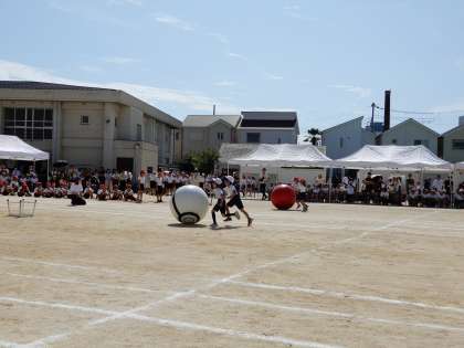 (写真上)2年生の「淀川ゲットだぜ!」です。大きなボールを転がしながら、赤と白の大接戦が繰り広げられました。