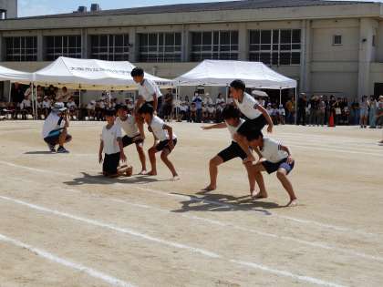 (写真中)6年生「BRAVE 淀川大乱舞2024」です。子どもたちの、組み立て体操です。土にまみれての姿が、かっこいいです。