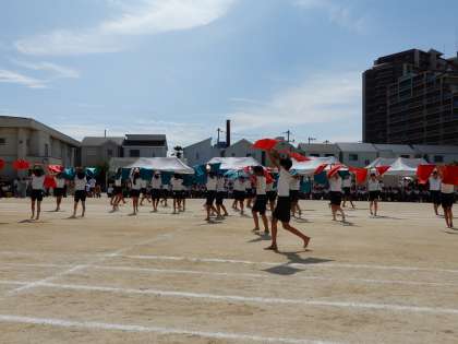 (写真下)6年生のフラッグが、青空にはためきます。小学校生活最後の演技です。会場から大きな拍手が起こりました。
